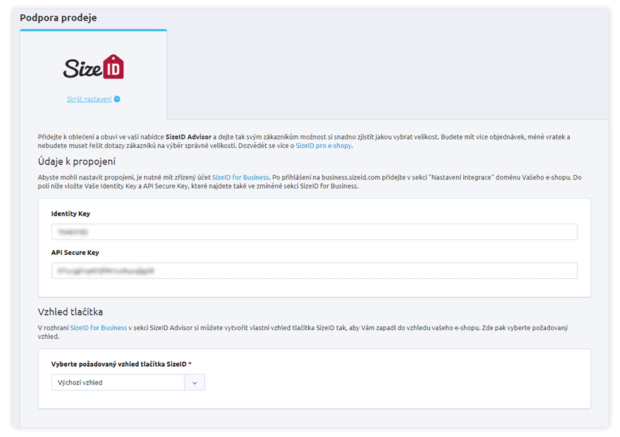 - Do polí v administraci e-shopu poté vložte Vaše Identity Key a API Secure Key, které najdete také ve zmíněné sekci SizeID for Business.