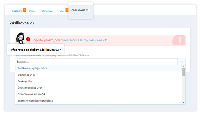 Důležitým nastavením je poslední záložka Zásilkovna v3, kde vyberete
