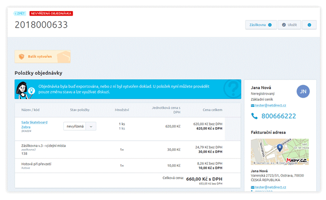 Po opravě daných polí v editaci objednávky již můžete úspěšně balík vytvořit.