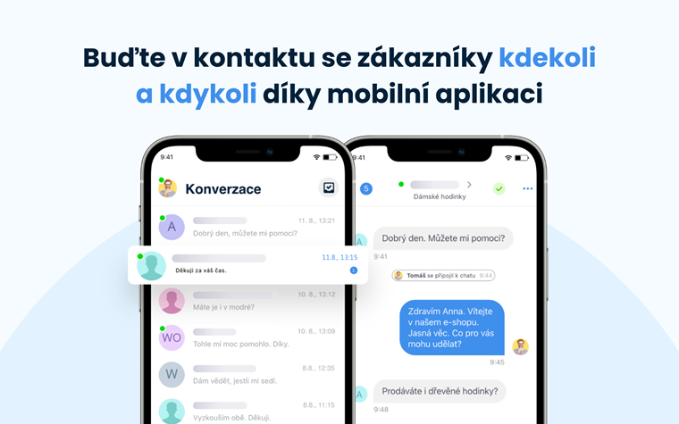 Nenechte si ujít žádnou příležitost. S naší mobilní aplikací budete stále v kontaktu se svými zákazníky. Odpovídejte na dotazy i v době, kdy vaše konkurence spí. Aplikace je dostupná pro
