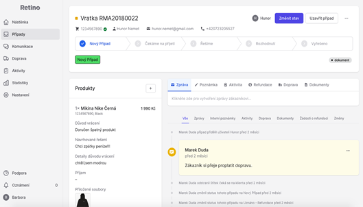 Retino automaticky komunikuje se zákazníkem a informuje jej o každé důležité změně v otevřeném případu. Dále automatizuje objednávání dopravy, refundace, vytváření dokumentů a řadu dalších volitelných úkolů. V závislosti na typu sortimentu může Retino ušetřit až 90% času stráveného odbavením vratek a reklamací.