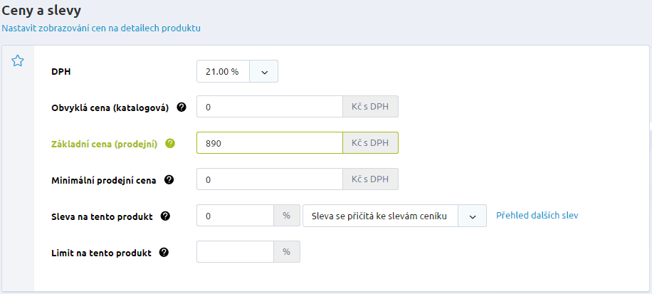 „Základní cena (prodejní)“, která se nachází na detailu produktu v záložce Ceny.