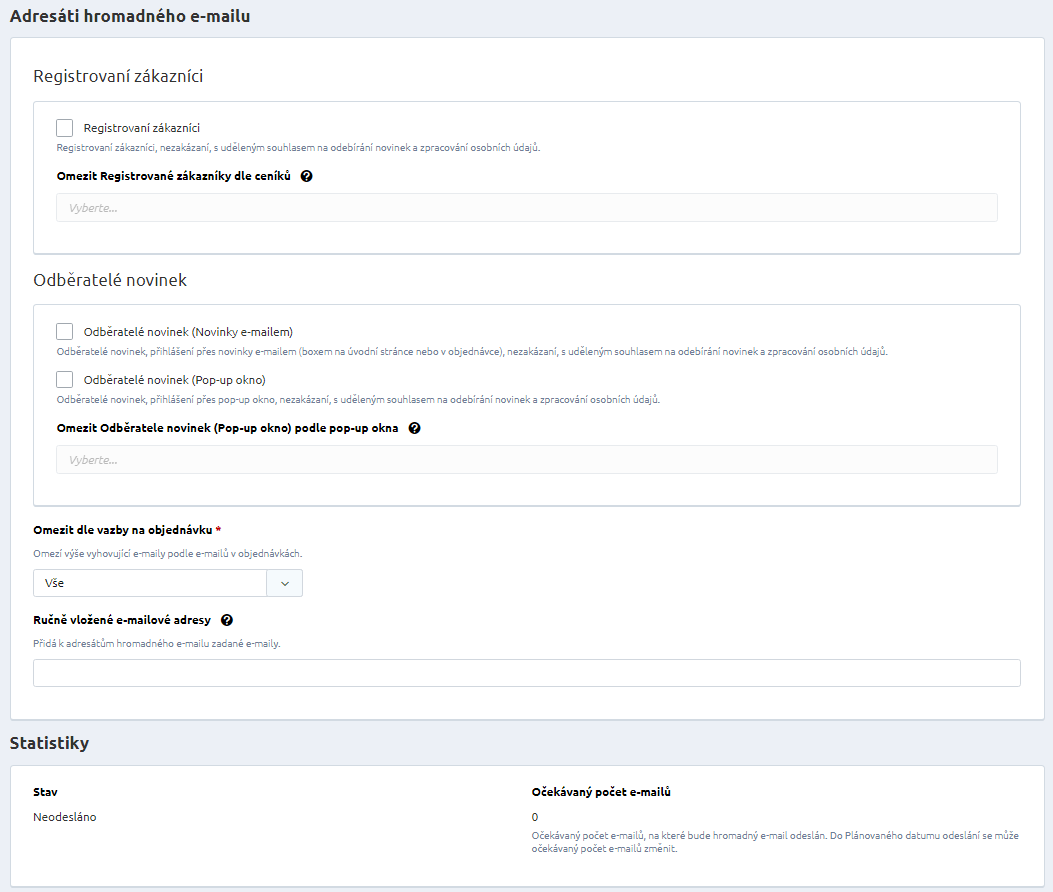 Registrovaní zákazníci, nezakázaní, s uděleným souhlasem na odebírání novinek a zpracování osobních údajů. Tyto zákazníky vyberete všechny, nebo v sekci Omezit vyberete pouze zákazníky z určitých ceníků.