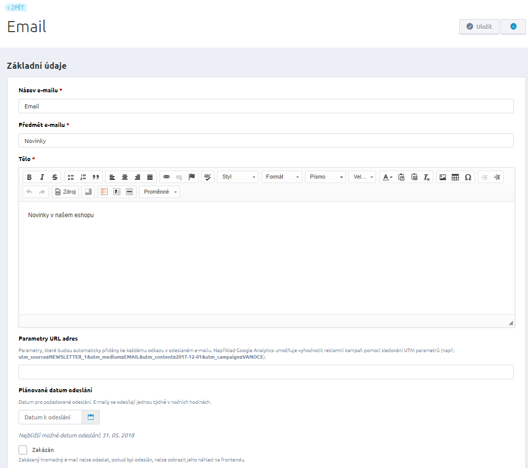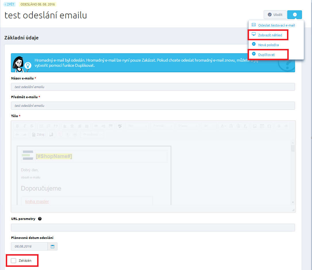 Aby mohla být e-mailová adresa použita v hromadné e-mailu je podmínkou kombinace Zakázán – NE a Udělen souhlas – ANO.