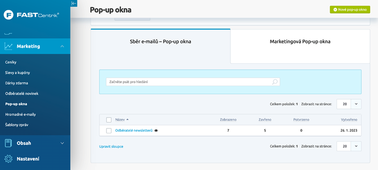 Ve výpisu vždy vidíte, kolik aktuálně máte nastavených vyskakovacích oken, které jsou viditelné (znak oka vedle názvu) a statistiky zobrazení, zavření, potvrzení.