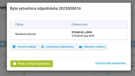 Objednávku můžete vytvořit za anonymního zákazníka, tzn. že u zákazníka nebudete vyplňovat osobní údaje. Pro takového zákazníka je automatiky přednastaveno místo dopravy osobní odběr. Zákazníkovi můžete nastavit také slevový kupón či jinou slevu, Povinné pole jsou však produkt, který zákazník nakupuje a vybrání platby. Poté můžete objednávku dokončit zeleným tlačítkem ,,Dokončit objednávku” a poté se vám zobrazí toto okno. Můžete si tedy vytisknout doklad, objednávku nebo ji zaslat na e-mail.