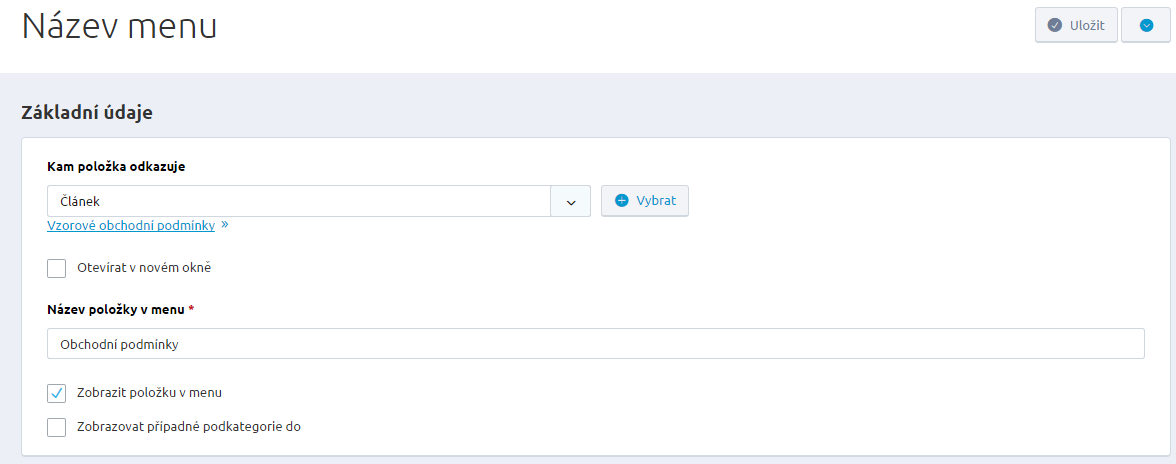Pomocí dvou checkboxů určíte, zda se má vytvářená položka zobrazovat v menu nebo nikoliv a nastavíte úroveň zobrazení podkategorií.