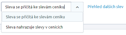 Pro každý produkt zvlášť je možné zadat slevu v poli „Sleva na tento produkt“. V případě, že zadáváte tuto cenu, je nutné zvolit, zda se sleva bude přičítat ke slevám v jednotlivých cenících anebo má nahradit ceníkové slevy.