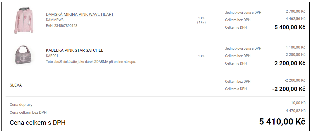 Dokončená objednávka má na svém detailu výpis položek a slev, pokud je dárek samostatně koupitelný + texty, že toto zboží získáváme jako dárek ZDARMA