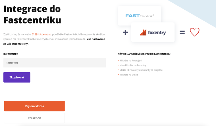 - V posledním kroku nápovědy, po zadání URL adresy, Foxentry rozpozná, že máte e-shopové řešení FastCentrik a poskytne vám script, který bude potřebný pro implementaci.