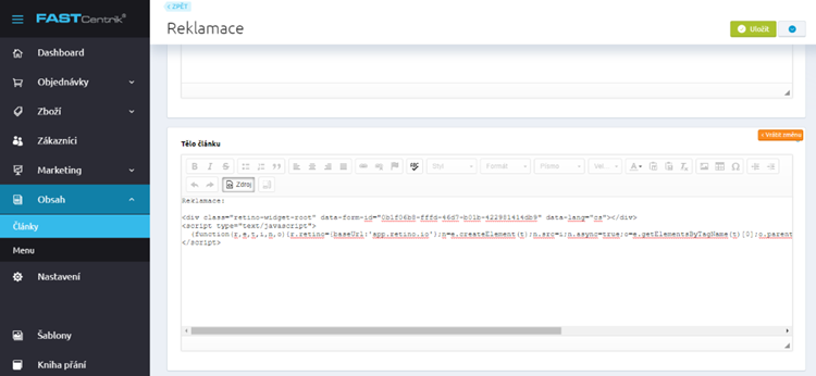 4./ Script vložte do těla článku ve FastCentriku a uložte.
