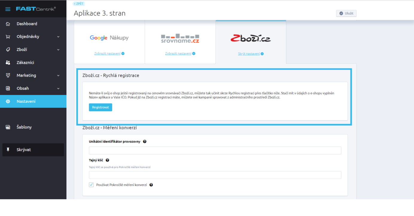 3. Pokud ještě nemáte svůj e-shop registrovaný na cenovém srovnávači Zboží.cz, můžete tak učinit skrze Rychlou registraci