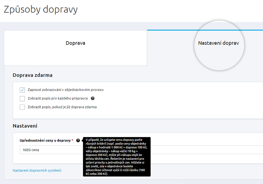 - V oddíle Nastavení si vyberete, zda chcete upřednostňovat nižší, či vyšší cenu dopravného. Nastavení této informace je povinné, aby bylo při objednávce jasné, která cena dopravného má prioritu. Pokud totiž určujete cenu dopravy podle více kritérií (např. podle ceny, nebo váhy objednávky), může dojít ke střetu cen.