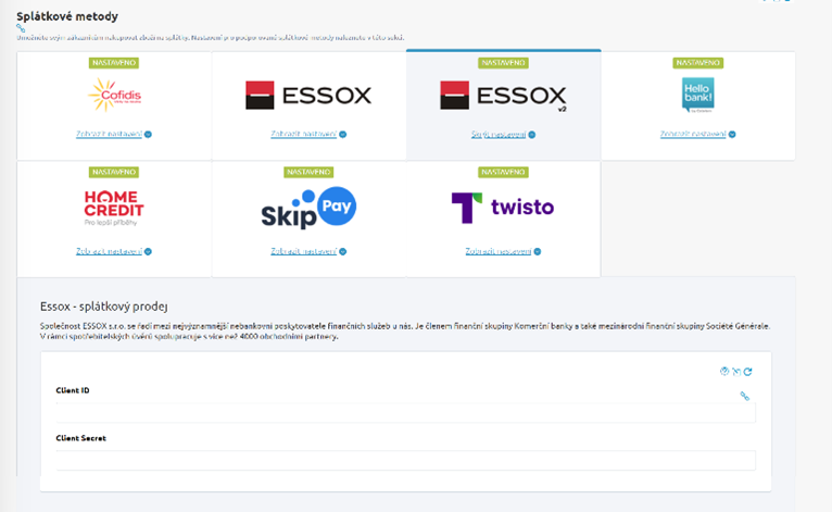 - Cesta v nastavení: Nastavení/Aplikace 3. stran/Splátkové metody/ESSOX