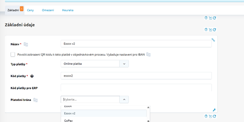 Nastavení – Platby založíte novou platbu a vyberete Platební bránu Essox v2, čímž se vám otevře