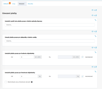 4. V záložce Omezení si poté vyberete, pro jaké zákazníky, či dopravu budete tuto platbu podporovat a případně omezíte na určitou částku.