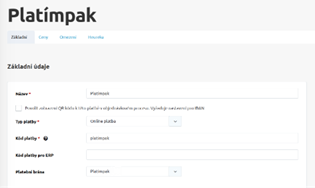 3. V nastavení dané platby si vyberete potřebné údaje, jako název, typ platby (Online platba), kódu, případně párovacího kódu pro ERP systémy a Platební brána(Platímpak) a další údaje, jako u ostatních plateb. Případně můžete využít šablony v modré části, kde poté doplníte pouze platební bránu(Platímpak)