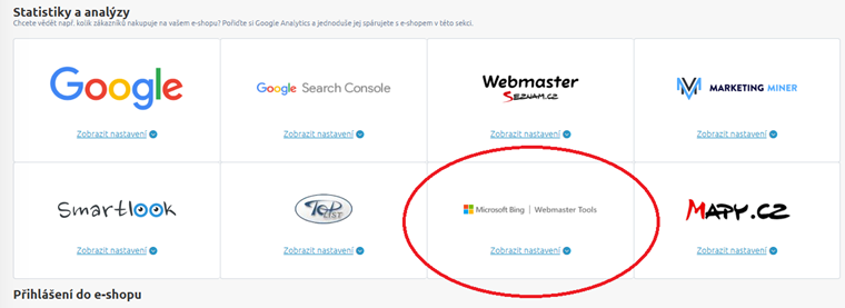 Bing funguje obdobně jako Google Search Console, a je využíván některými AI nákupčími. Nastavení je možné najít v administraci e-shopu Propojení - Statistiky a analýzy.
