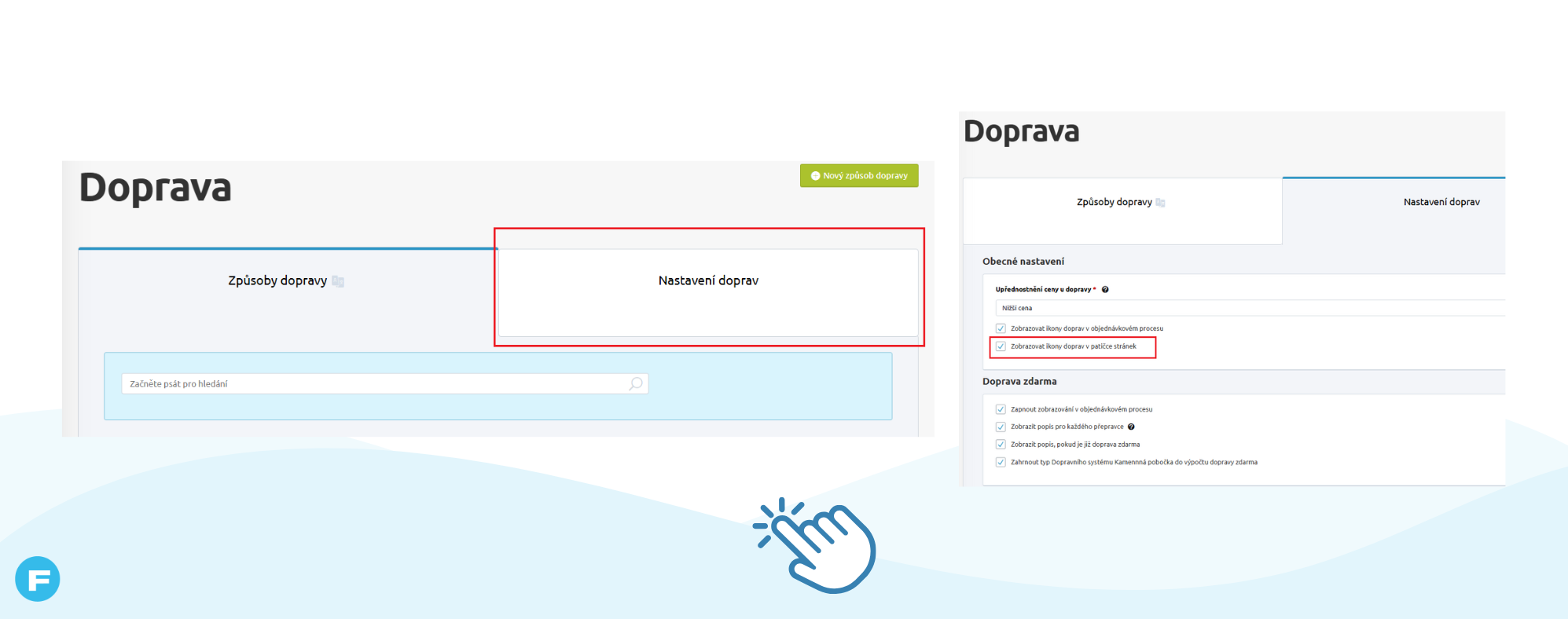 Pro dopravu: Nastavení → Doprava → záložka „Nastavení doprav“ → Checkbox „Zobrazovat ikony doprav v patičce stránek“