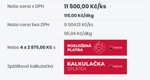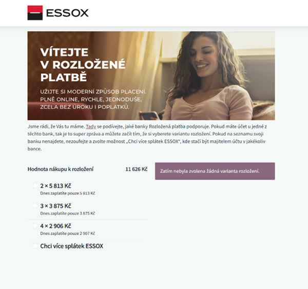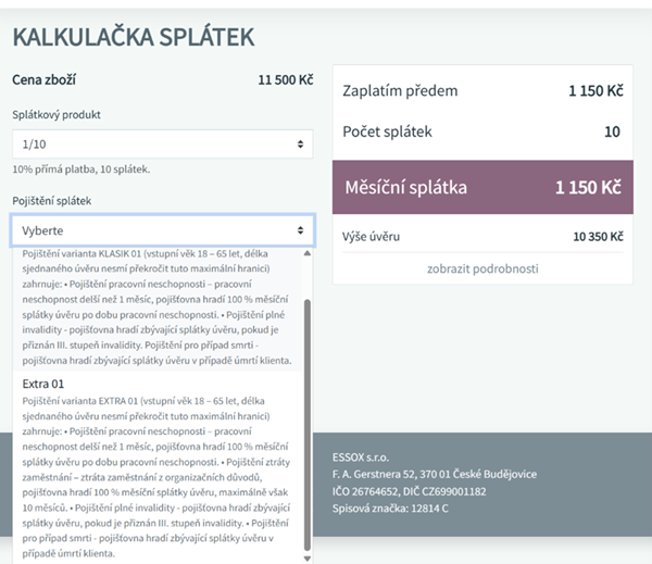 Při založené platbě se poté na produktech zobrazí kalkulačka splátek. V košíku uvidíte danou platbu, která po zvolení zákazníkem přesměruje zákazníka na stránky essox.