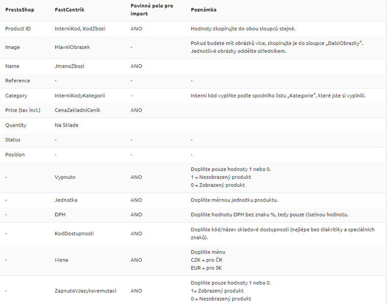 Párovací tabulka produktů Excel PrestaShopu vs. Excel FastCentriku