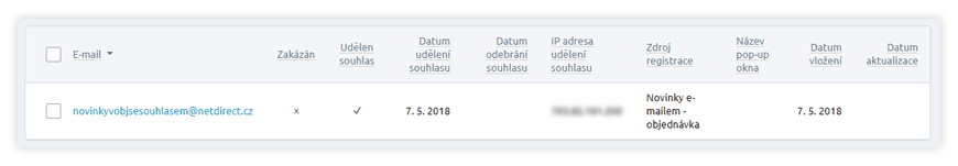 - Přibyly také informace: Souhlas udělen, IP adresa, Datum udělení/odebrání souhlasu.