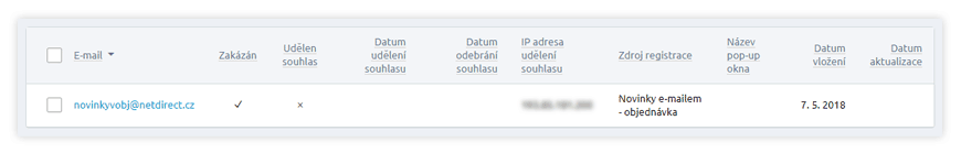 - Do přehledu byly vyvedeny nové sloupce s těmito údaji: Zakázán, Udělen souhlas, Datum udělení/odebrání souhlasu, IP adresa udělení souhlasu, Datum vložení, Datum aktualizace.