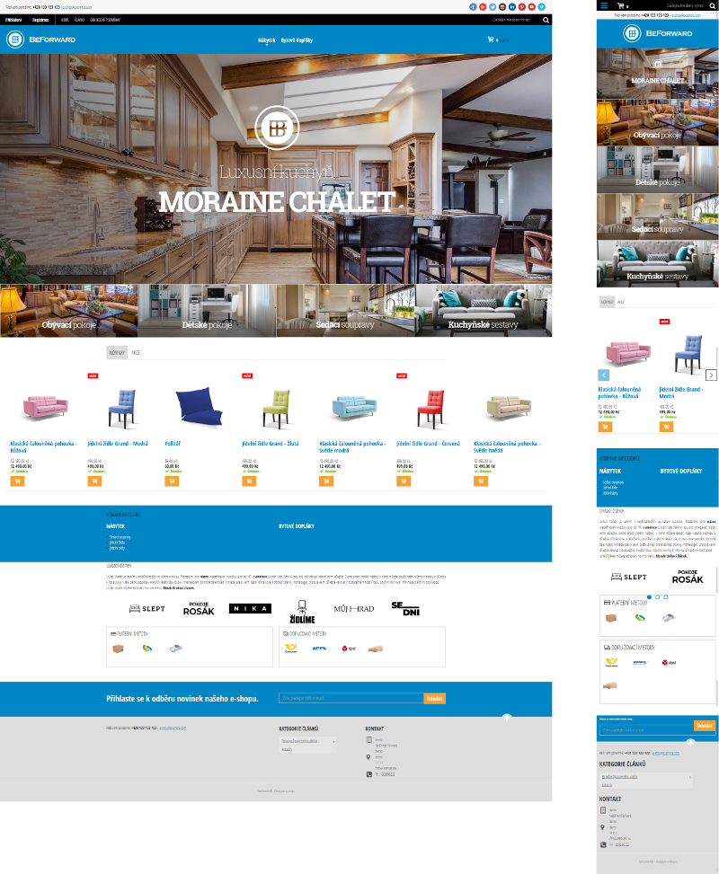 Se šablonou Forward se dostanete na výsluní a udržíte krok se současnými e-commerce trendy. Celkový design šablony dotažený do posledního detailu. Tato šablona je jako stvořená například pro prodej nábytku a jiného bytového vybavení, chovatelské potřeby a sport. Má totiž velké množství bannerových ploch, které jsou rozmístěny různě na hlavní stránce a přidají tak na kráse vašim designovým produktům.